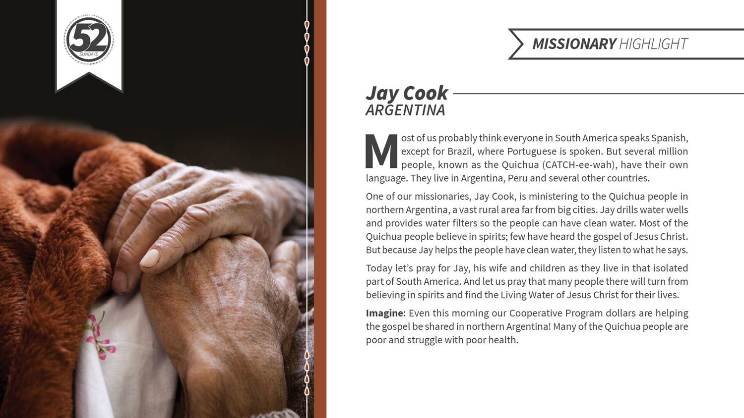March 8, 2015March 8, 2015 52 Sundays of Missions: March 8, 2015 Each week, we spend time praying for a missionary or missions venture in Virginia, North America or around the globe. This week, please pray for Jay Cook and his ministry in Argentina. Share this: Click to share on X (Opens in new window) X Click to share on Facebook (Opens in new window) Facebook Like Loading... Related