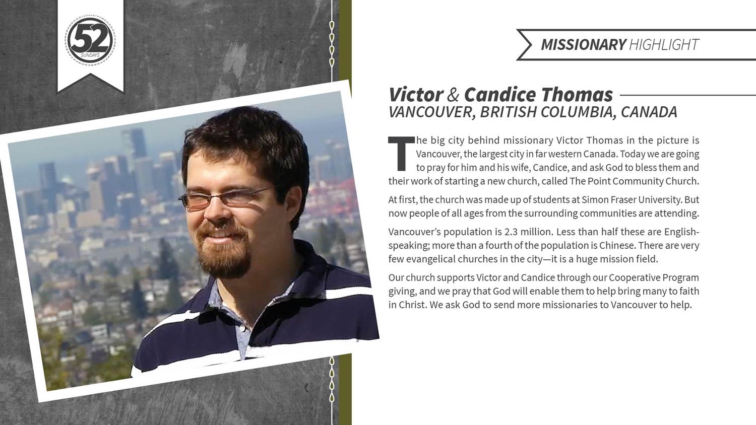 March 17, 2015March 17, 2015 52 Sundays of Missions: March 15, 2015 Each week, we spend time praying for a missionary or missions venture in Virginia, North America or around the globe. This week, please pray for Victor and Candice Thomas in Vancouver. Share this: Click to share on X (Opens in new window) X Click to share on Facebook (Opens in new window) Facebook Like Loading... Related