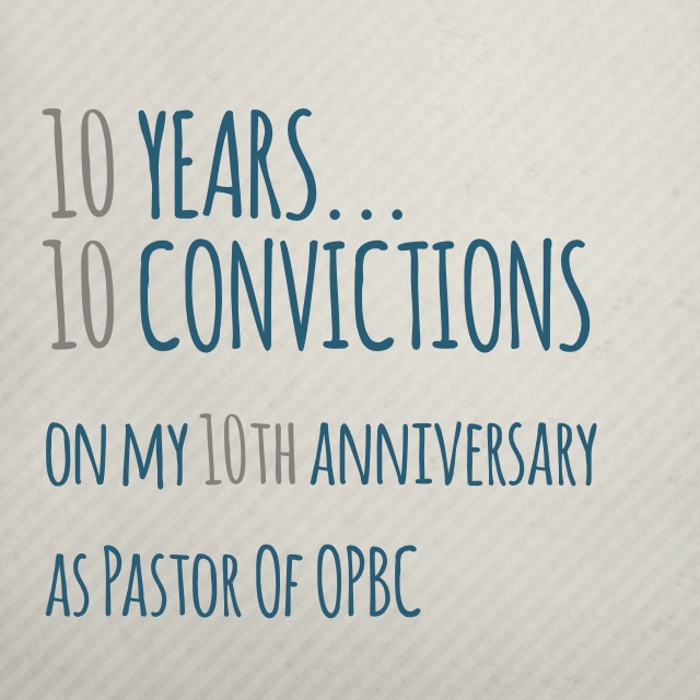 Tomorrow at OPBC, I plan to present 10 Convictions on my 10th Anniversary as Pastor of OPBC… a look at how some of my convictions have strengthened, and some have changed over the past 10 years. We will look at the past, but more importantly look honestly at the present and with hope at the future of what God has planned at OPBC. I hope you will join us.