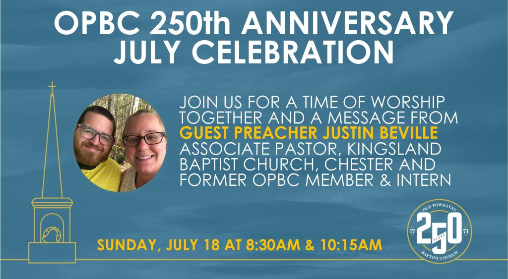 AND MARK YOUR CALENDARS FOR JULY 18! We will have our next 250th Anniversary Special Guest, Justin Beville. Justin serves as Associate Pastor of Kingsland Baptist in Chester and grew up at OPBC and served as our intern for several summers. We look forward to hearing God’s Word from Justin at 8:30AM and 10:15AM on July 18!
