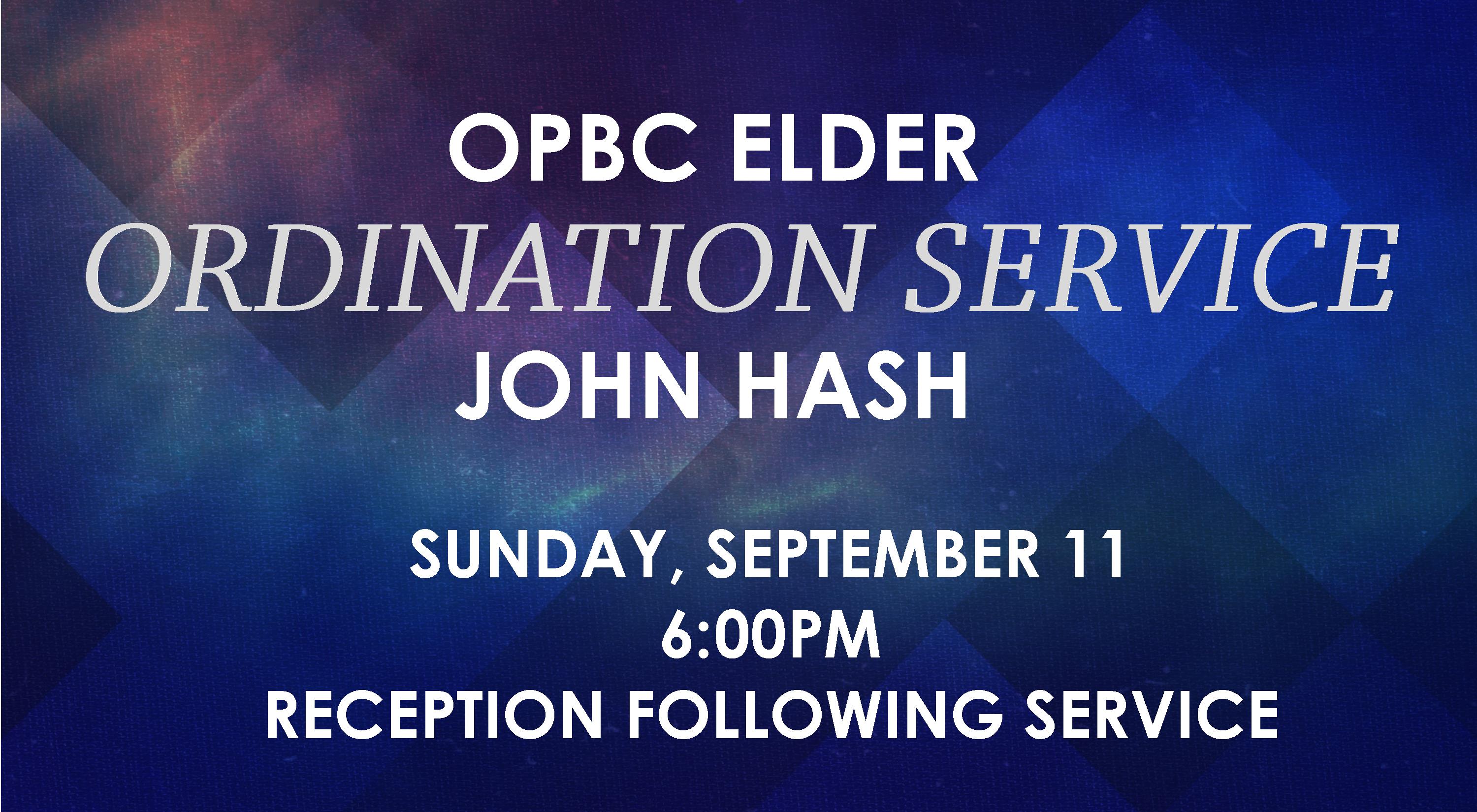 THEN, COME BACK AT 6PM FOR A SPECIAL CELEBRATION WITH JOHN HASH AS HE IS SET APART AS A LAY ELDER OF OPBC.