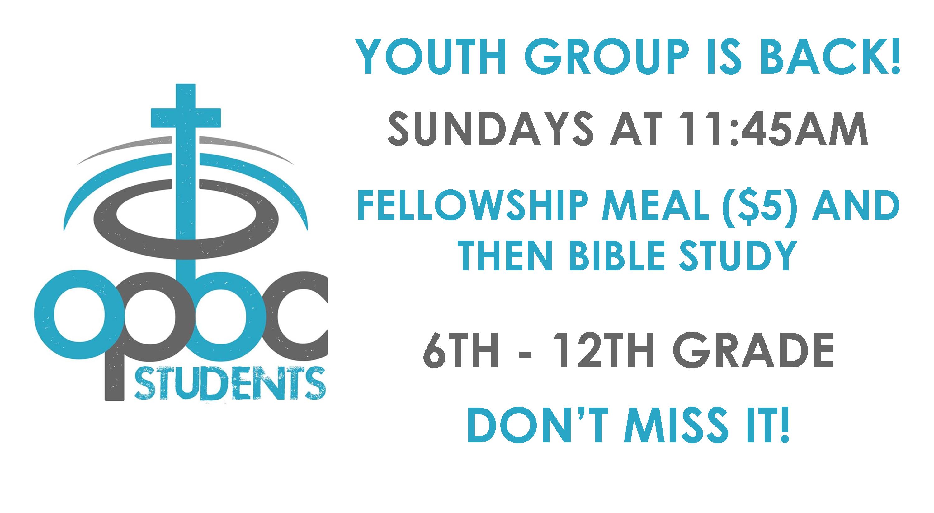 Then Stick around for a CHURCH-WIDE POTLUCK lunch and NEW SUNDAY SCHOOL CLASSES led by Kenny Van Horn and John Hash on Romans and Matthew. And YOUTH GROUP IS BACK for 6th-12th Graders – Meal at 11:45AM and Sunday School/ Youth Group to follow.