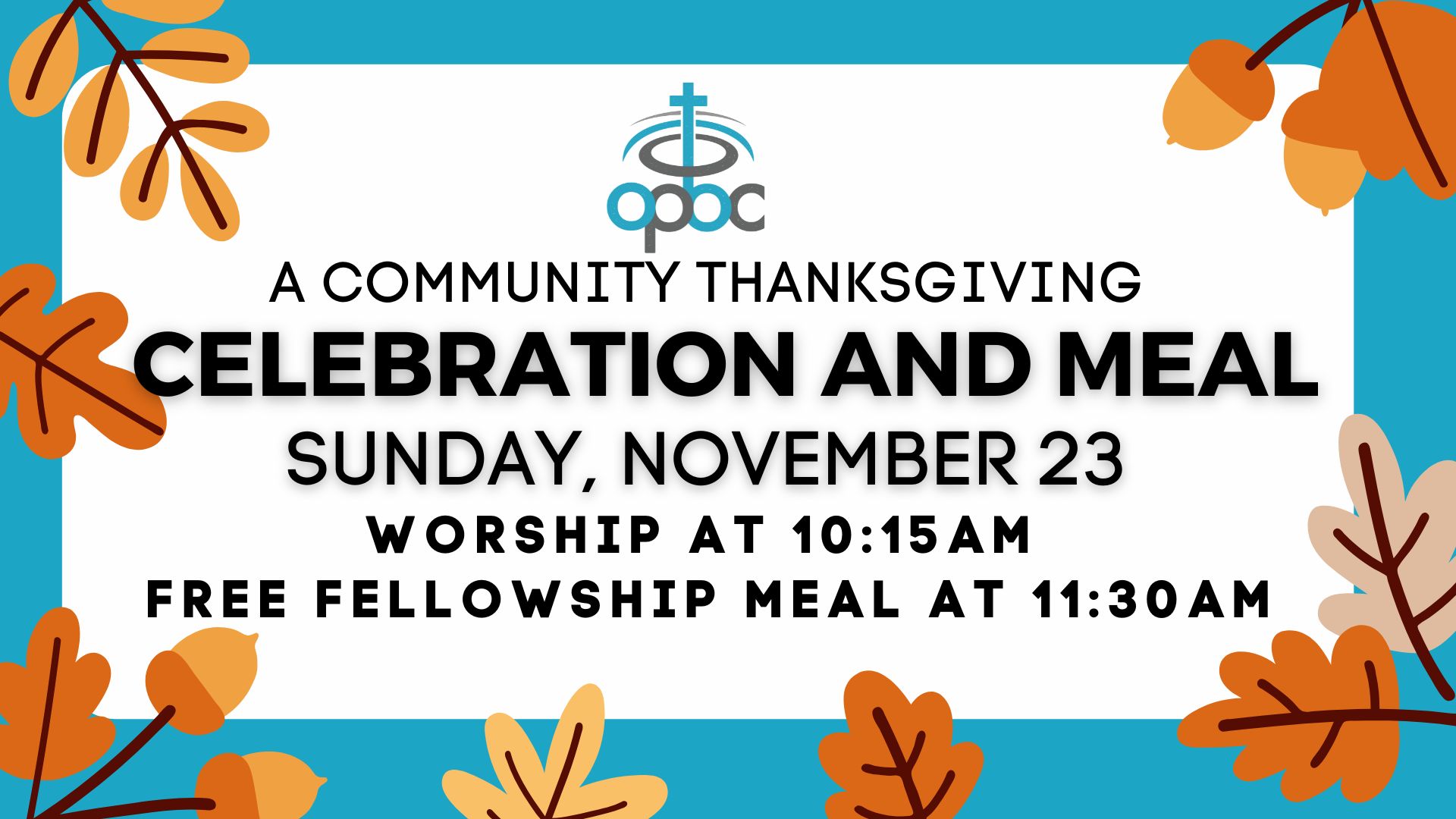 Join us at 10:15AM ONLY (No 8:30AM Service, No OPBCKids) as families worship together for our Thanksgiving Celebration! Lots of Music, Praise, Prayer and God’s Word. Then stick around for a Thanksgiving Feast!
